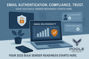 Gmail’s new bulk sender rules are reshaping email marketing and deliverability. Starting November 2025, senders must align SPF and DKIM, publish DMARC, and maintain complaint rates below 0.3 %. At Poole Technology Solutions, we help businesses prepare now to ensure compliance and protect their brand reputation.